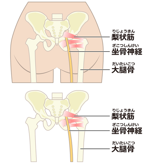 その硬くなった筋肉の中を坐骨神経、及び血管が走行していますので、結果、神経と血液の流れが阻害されることで痛み、しびれ、筋力低下などを起こします。