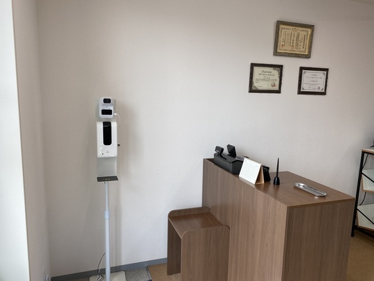 受付カウンター左側にある検温オートディスペンサーで検温と手指消毒後、受付をお願いします。